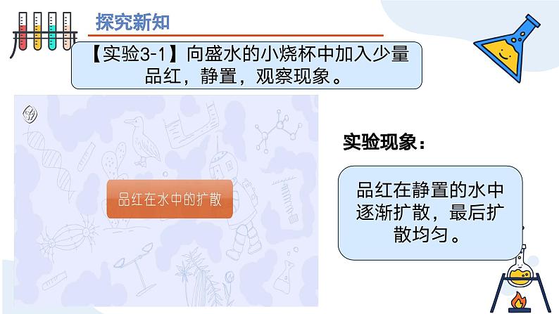 【实验3-1】向盛水的小烧杯中加入少量品红,静置,观察现象。