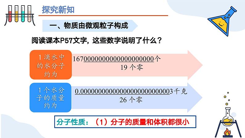 这是一份初中化学课题1 分子和原子课文ppt课件,共25页。PPT课件主要包含了创设情境,导入新课,实验品红的扩散,物质由微观粒子构成,算一算,分子是由原子构成的,水的蒸发,化学变化,水的通电分解,分子和原子的关系等内容,欢迎下载使用。