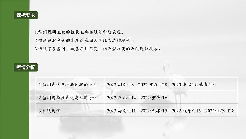 1.举例说明生物的性状主要通过蛋白质表现。2.概述细胞分化的本质是基因选择性表达的结果。3.概述某些基因中碱基序列不变,但表型改变的表观遗传现象。