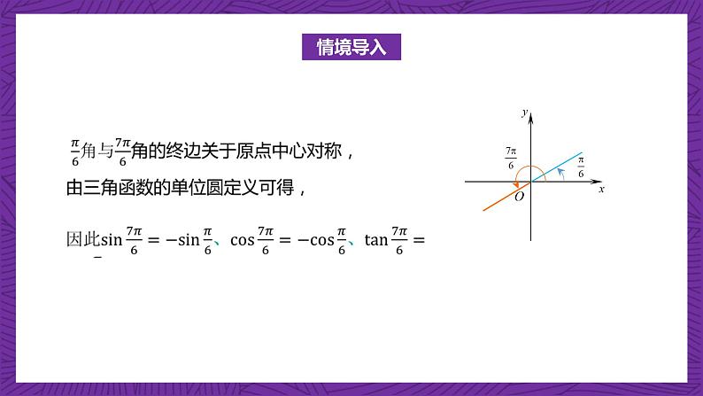 高教版(2021)基础模块上册第4章 三角函数4.5 诱导公式精品课件ppt: 这是一份高教版(2021)基础模块上册<a href="/sx/tb_c4030599_t3/?tag_id=26" target="_blank">第4章 三角函数4.5 诱导公式精品课件ppt</a>,共19页。PPT课件主要包含了情境导入,探索新知,建立单位圆,典例剖析,典例3化简,巩固练习,巩固3计算,归纳总结,布置作业等内容,欢迎下载使用。