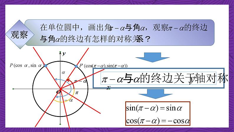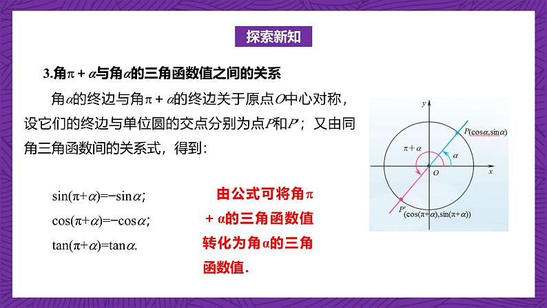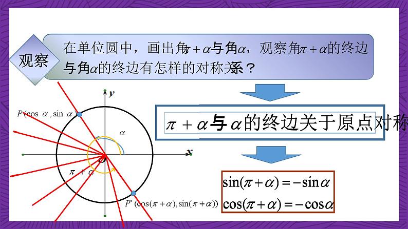 角α的终边与角+α的终边关于原点O中心对称,设它们的终边与单位圆的交点分别为点P和P;又由同角三角函数间的关系式,得到: