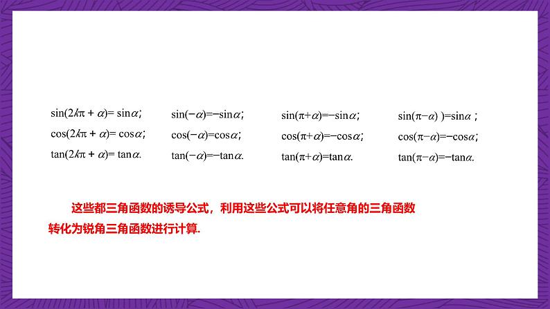 这些都三角函数的诱导公式,利用这些公式可以将任意角的三角函数转化为锐角三角函数进行计算.
