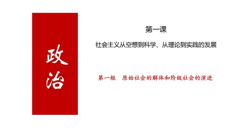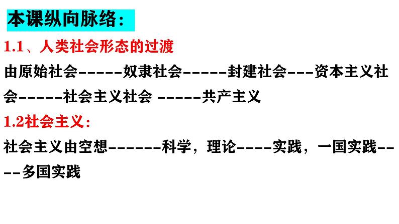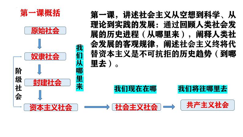 第一课社会主义从空想到科学、从理论到实践的发展课件-2024届高考政治一轮复习统编版必修一中国特色社会主义: 这是一份第一课社会主义从空想到科学、从理论到实践的发展课件-2024届高考政治一轮复习统编版必修一中国特色社会主义,共45页。PPT课件主要包含了教材体系,原始社会,奴隶社会,从原始社会到奴隶社会,封建社会,资本主义社会,①经济上,②政治上,③文化上,②生产关系特点等内容,欢迎下载使用。