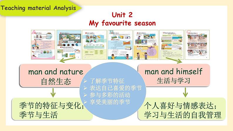 单元总目标:了解季节特征,表达自己喜爱的季节, 参与多彩的活动,享受美丽的季节。