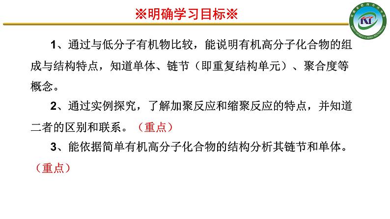 1、通过与低分子有机物比较,能说明有机高分子化合物的组成与结构特点,知道单体、链节(即重复结构单元)、聚合度等概念。2、通过实例探究,了解加聚反应和缩聚反应的特点,并知道二者的区别和联系。(重点)3、能依据简单有机高分子化合物的结构分析其链节和单体。(重点)