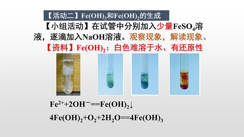 【小组活动】在试管中分别加入少量FeSO4溶液,逐滴加入NaOH溶液。观察现象,解读现象。 【资料】Fe(OH)2:白色难溶于水、有还原性