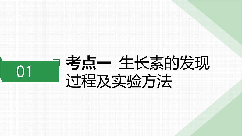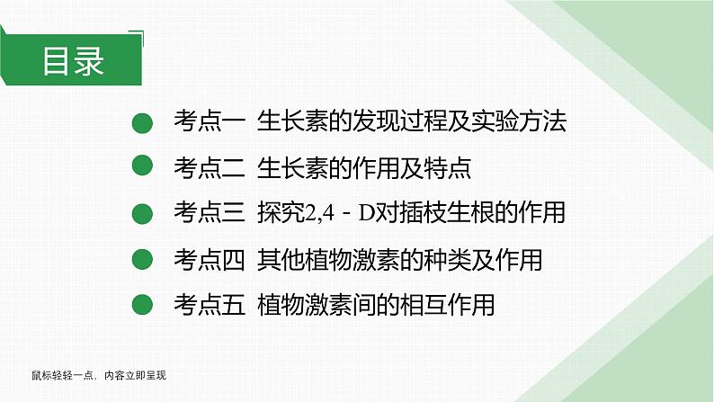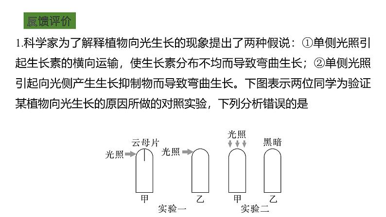 第五章 植物生命活动的调节浙科版(2019)生物 选择性必修1 稳态与调节考点一 生长素的发现过程及实验方法考点二 生长素的作用及特点考点五 植物激素间的相互作用考点四 其他植物激素的种类及作用考点三 探究2,4-D对插枝生根的作用考点一 生长素的发现过程及实验方法01(1)生长素的发现达尔文父子生长素的发现实验及相关结论拜尔波森•詹森促进生长不对称运输不均匀分布温特琼脂块化学物质生长素尖端下面(2)实验相关结论1.科学家为了解释植物向光生长的现象提出了两种假说:①单侧光照引起生长素的横向运输,使生长素分布不均而导致弯曲生长;②单侧光照引起向光侧产生生长抑制物而导致弯曲生长。下图表示两位同学为验证某植物向光生长的原因所做的对照实验,下列分析错误的是反馈评价A.若实验一甲、乙两组都向光生长,则说明假说②成立B.若实验二甲、乙两组结果无明显差异,则说明假说①成立C.若实验一甲直立生长、乙向光生长,则实验二应表现为甲生长速度比 乙快D.若实验一甲、乙两组都向光生长,则实验二应该表现为甲的生长速度 比乙慢√2.为研究吲哚乙酸(IAA)与脱落酸(ABA)的运输特点,用放射性同位素14C标记IAA和ABA开展如图所示的实验。下列叙述正确的是A.若图中AB为茎尖切段,琼脂块①和②中出现较强放射性的是②B.若图中AB为成熟茎切段,琼脂块①和②中出现放射性的只是②C.若图中AB为茎尖切段,琼脂块③和④中均出现了较强放射性,说明ABA在茎尖的 运输是极性运输D.若图中AB为成熟茎切段,琼脂块①和②中均出现了较强放射性,说明IAA在成熟 茎切段中的运输不是极性运输√反馈评价考点二 生长素的作用及特点02生长素促进植物生长细胞伸长茎果实抑制敏感程度顶端优势合成和运输分生组织生长素调节植物生长时表现出两重性1.生长素浓度在低浓度时促进生长,浓度太高会抑制生长,甚至导致植物死亡—— 两重性 BAC1、曲线AB段表示:2、B点表示:3、BC段表示: 4、C点以后表示:随生长素浓度升高,对根生长的促进作用加强。促进根生长的最适浓度随生长素浓度增加,对根的生长促进作用减弱。随生长素浓度的增加,对根的生长抑制作用增强。5、C点表示生长素:有作用,但促进和抑制作用相等2.不同器官敏感程度:根>芽>茎③器官种类:不同器官对生长素的敏感程度不同①浓度:在浓度较低时促进生长,在浓度较高时抑制生长。②植物细胞的成熟情况:幼嫩细胞对生长素敏感,衰老细胞则比较迟钝。3.不同种类的植物敏感程度:双子叶植物>单子叶植物双子叶植物单子叶植物应用:用一定浓度的生长素类似物作为除草剂。除草剂浓度范围小麦、玉米、水稻是单子叶植物,而其中的杂草往往是双子叶植物。4.不同细胞敏感程度:幼嫩细胞>老细胞1.有人从真菌中提取到甲、乙和丙三种生长素类似物,分别测试三种类似物的不同浓度对莴苣幼根生长的影响,结果如下图。以下说法不正确的是A.甲、乙和丙对莴苣幼根生长的影响均有两重性B.在0~20 ppm范围内,甲对莴苣幼根的促进作 用大于丙C.乙的浓度大于20 ppm后,对莴苣幼根生长起抑 制作用D.据图推测,用30 ppm的甲处理莴苣幼芽可抑制其生长√反馈评价A.①和② B.①和③C.②和③ D.②和④2.图中(1)表示燕麦幼苗在单侧光照下的生长情况;(2)表示幼苗对不同浓度生长素的不同反应;则(3)中表示a、b两点生长素浓度变化的曲线应分别是√反馈评价考点三 探究2,4-D对插枝生根的作用031.实验原理2,4-D是人工合成的经常使用的 ,能够促进植物生长,包括促进插枝生根等。且不同浓度的2,4-D促进生根的效果不同。2.实验步骤(1)预实验生长素类似物范围梯度(2)插枝的方法① _ :在培养液中 2,4-D溶液配制成预设的浓度。② :在扦插前把枝条 放进不同浓度的2,4-D溶液中 数秒钟(约5 s)。滴加水培法土培法基部浸蘸(3)实验方案长势相同蒸馏水随机等分(2022·嘉兴模拟)某兴趣小组探究2,4-D对某植物插枝生根的作用,实验结果如下表。下列叙述不合理的是注:a1、a2、a3、a4依次增大。反馈评价A.对照组有部分插枝没有根B.a2和a4浓度的2,4-D溶液促进根分化的效果相近C.实验所用插枝的芽已被去除D.以总长度为观测指标时,a4浓度的2,4-D溶液抑制生根√考点四 其他植物激素的种类和作用04特定蛋白质其他植物激素的种类及作用分裂侧芽萌发延缓根尖分裂旺盛果实伸长细胞分裂茎萌发休眠抑制促进休眠萌发成熟抗逆性关闭(1)植物体内源激素的缺点①含量极微;②性质 (填“极”或“不”)稳定;③应用中面临难以提取,不易 ,成本过高等问题。(2)植物生长调节剂:人们 和筛选出许多化学结构和生理特性与植物激素相似的 。不保存合成活性物质植物激素的应用(3)植物生长调节剂的应用①2,4-D防止番茄、甜椒等 ,促进马铃薯 并提高产量,诱导形成 等;用作 。②NAA和IBA:促进各类植物 __ ,防止 ,促进生长等。两者还常常被复合加工成为混合制剂,其生理活性更高,使用范围更广。③用乙烯利促进黄瓜的雌花分化;促进香蕉、柿、番茄的果实成熟。④施用矮壮素(生长延缓剂)防止棉花徒长、促进结实。⑤用一定浓度的生长素类似物溶液补救因花粉发育不良或暴风雨袭击影响授粉而导致的瓜果类作物产量下降。(注:此措施不可用于挽救以收获种子为目的的各种粮食作物和油料作物的减产问题)落花落果发芽无籽番茄除草剂扦插枝条生根落花落果1