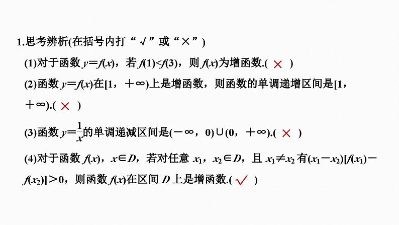 解析 (1)错误,应对任意的x1<x2,都有f(x1)<f(x2)成立才可以.(2)错误,反例:f(x)=x在[1,+∞)上为增函数,但f(x)=x的单调区间是(-∞,+∞).(3)错误,此单调区间不能用“∪”连接,故单调递减区间为(-∞,0)和(0,+∞).