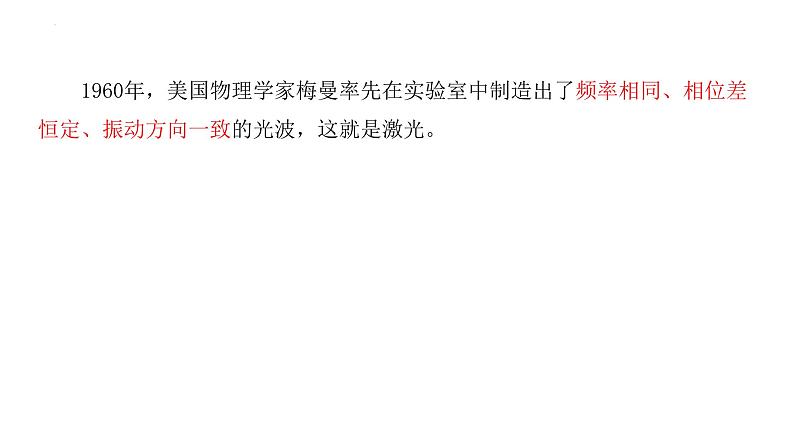 1960年,美国物理学家梅曼率先在实验室中制造出了频率相同、相位差恒定、振动方向一致的光波,这就是激光。