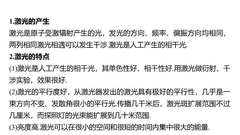 1.激光的产生激光是原子受激辐射产生的光,发光的方向、频率、偏振方向均相同,两列相同激光相遇可以发生干涉.激光是人工产生的相干光.2.激光的特点(1)激光是人工产生的相干光,其单色性好、相干性好.用激光做衍射、干涉实验,效果很好.(2)激光的平行度好,从激光器发出的激光具有极好的平行性,几乎是一束方向不变、发散角很小的平行光.传播几千米后,激光斑扩展范围不过几厘米,而探照灯的光束能扩展到几十米范围.(3)亮度高.激光可以在很小的空间和很短的时间内集中很大的能量.