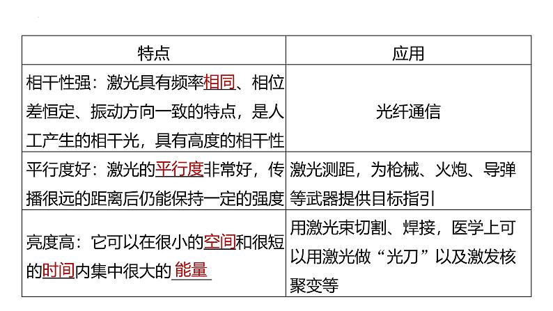 激光相关问题解题关键(1)熟记激光的主要特点及应用。(2)激光作为一种光,具有光的一切性质,能发生衍射、干涉、反射、折射等,遵从反射定律、折射定律等。