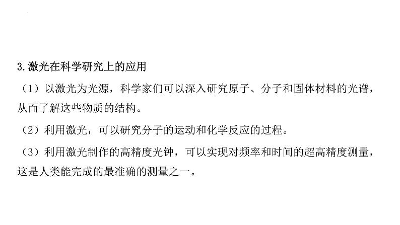 3.激光在科学研究上的应用(1)以激光为光源,科学家们可以深入研究原子、分子和固体材料的光谱,从而了解这些物质的结构。(2)利用激光,可以研究分子的运动和化学反应的过程。(3)利用激光制作的高精度光钟,可以实现对频率和时间的超高精度测量,这是人类能完成的最准确的测量之一。