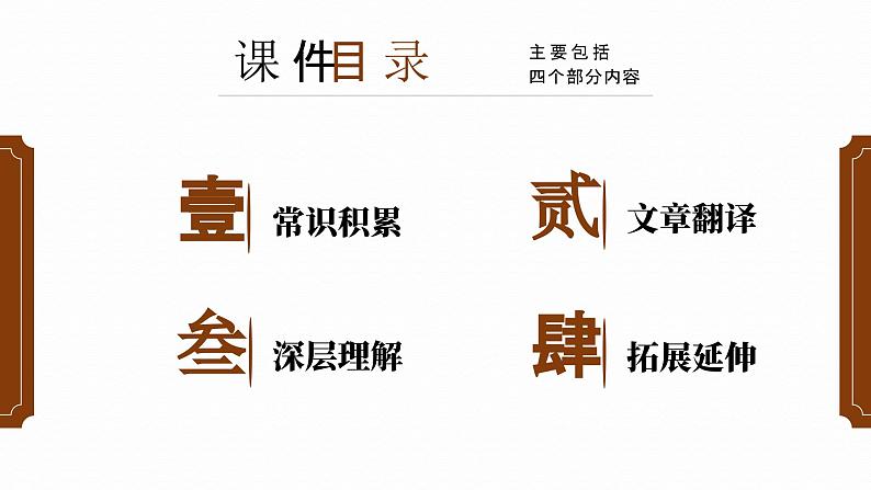 展开这是一份人教部编版(2024)九年级上册湖心亭看雪优秀ppt课件,共40页。PPT课件主要包含了学习目标,常识积累,课件目录,文章翻译,深层理解,拓展延伸,新课导入,第一部分,作者介绍,写作背景等内容,欢迎下载使用。