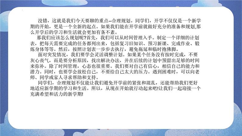 没错,这就是我们今天要聊的重点--合理规划。同学们,开学不仅仅是一个新学期的开始,更是一个全新的起点。如果我们能在开学前就做好充分的准备和规划,那么开学后的学习和生活就会更加有条不紊。 那我们应该怎么规划呢?首先,我们可以从时间管理入手。制定一个详细的计划表,把每天需要完成的任务都列出来,包括复习旧知识、预习新课、完成作业、锻炼身体等等。然后,按照计划表一步步去执行,避免拖延和临时抱佛脚。 面对突发情况,我们要学会灵活调整计划。如果某个任务没有按时完成,不要灰心丧气,而是要分析原因,找出解决办法,并在后续的计划中预留出足够的时间来弥补。除了时间管理,心态也很重要。我们要对自己有信心,相信自己的能力和潜力。同时,也要学会放松自己,不要给自己太大的压力。遇到困难时,可以向老师、同学或家人寻求帮助和支持。 同学们,合理规划不仅能让我们避免开学前的紧张和混乱,还能帮助我们更好地适应新学期的学习和生活。所以,从现在开始就行动起来吧!让我们一起迎接一个充满希望和活力的新学期!