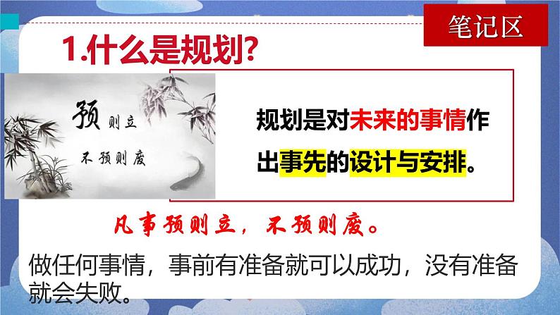 这是一份初中政治 (道德与法治)人教版(2024)七年级上册(2024)规划初中生活多媒体教学ppt课件,共26页。PPT课件主要包含了自主预习,1什么是规划,笔记区等内容,欢迎下载使用。