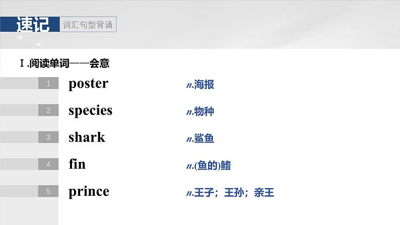 pster n.海报species n.物种shark n.鲨鱼fin n.(鱼的)鳍prince n.王子;王孙;亲王
