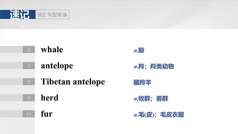whale n.鲸antelpe n.羚;羚类动物Tibetan antelpe藏羚羊herd n.牧群;兽群fur n.毛(皮);毛皮衣服