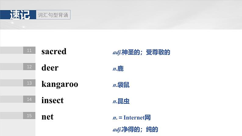 sacred adj.神圣的;受尊敬的deer n.鹿kangar n.袋鼠insect n.昆虫net n.=Internet网adj.净得的;纯的