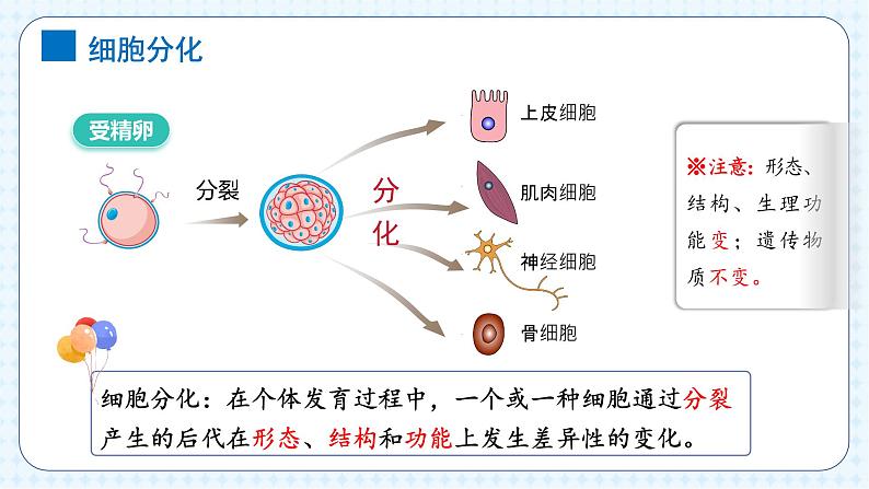 人教版 (新课标)七年级上册第二单元 生物体的结构层次第二章 细胞怎样构成生物体第二节 动物体的结构层次教学ppt课件: 这是一份人教版 (新课标)七年级上册<a href="/sw/tb_c4938_t3/?tag_id=26" target="_blank">第二单元 生物体的结构层次第二章 细胞怎样构成生物体第二节 动物体的结构层次教学ppt课件</a>,共19页。PPT课件主要包含了细胞分化,分裂与分化,受精卵,两个细胞,四个细胞,多个细胞,人体组织,分泌等,骨骼上,胃肠等器官管壁等内容,欢迎下载使用。