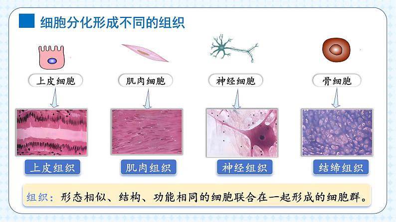 展开1、通过观察组织图片,结合直观的动画等资源,概述细胞分化的过程。分析资料,运用比较、归纳等方法,概括组织概念。(探究实践,科学思维) 2、利用显微镜观察人体的组织,描述构成不同组织细胞的特点,推测其功能。(探究实验、生命观念)3通过宏观和微观的角度,观察多细胞生物体的不同结构层次,引导学生形成生物体是一个统一整体的认识,形成爱护生命的态度意识。(生命观念,态度责任)