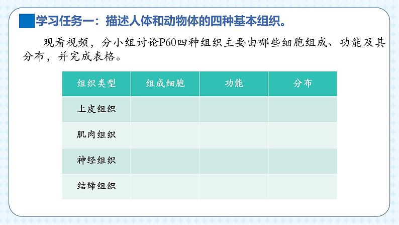 学习任务一:描述人体和动物体的四种基本组织。 观看视频,分小组讨论P60四种组织主要由哪些细胞组成、功能及其分布,并完成表格。