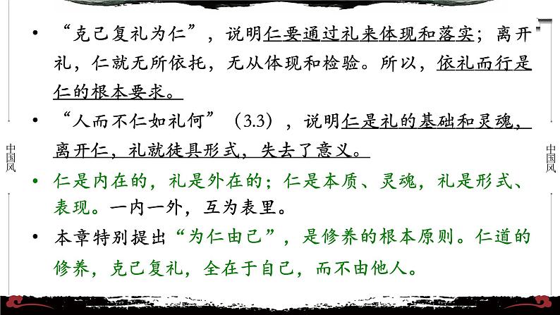 “克己复礼为仁”,说明仁要通过礼来体现和落实;离开礼,仁就无所依托,无从体现和检验。所以,依礼而行是仁的根本要求。“人而不仁如礼何”(3.3),说明仁是礼的基础和灵魂,离开仁,礼就徒具形式,失去了意义。仁是内在的,礼是外在的;仁是本质、灵魂,礼是形式、表现。一内一外,互为表里。本章特别提出“为仁由己”,是修养的根本原则。仁道的修养,克己复礼,全在于自己,而不由他人。