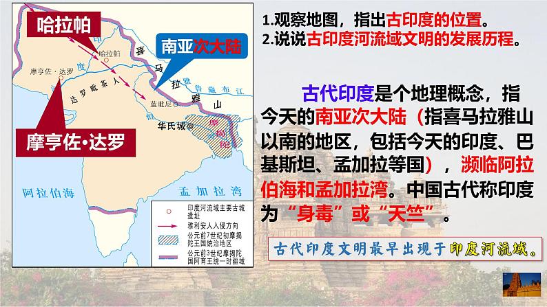 1.观察地图,指出古印度的位置。2.说说古印度河流域文明的发展历程。