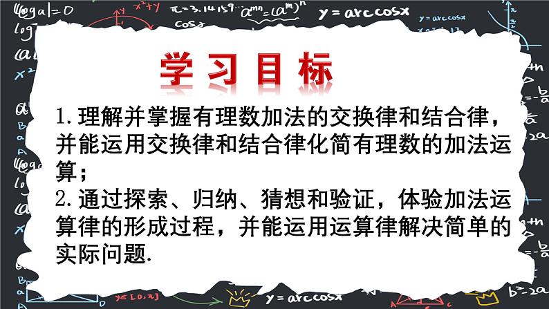 1.理解并掌握有理数加法的交换律和结合律,并能运用交换律和结合律化简有理数的加法运算;2.通过探索、归纳、猜想和验证,体验加法运算律的形成过程,并能运用运算律解决简单的实际问题.