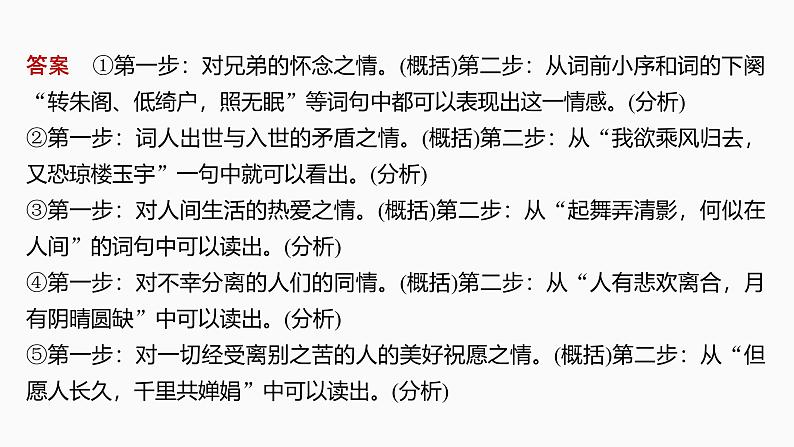 答案 ①第一步:对兄弟的怀念之情。(概括)第二步:从词前小序和词的下阕“转朱阁、低绮户,照无眠”等词句中都可以表现出这一情感。(分析)②第一步:词人出世与入世的矛盾之情。(概括)第二步:从“我欲乘风归去,又恐琼楼玉宇”一句中就可以看出。(分析)③第一步:对人间生活的热爱之情。(概括)第二步:从“起舞弄清影,何似在人间”的词句中可以读出。(分析)④第一步:对不幸分离的人们的同情。(概括)第二步:从“人有悲欢离合,月有阴晴圆缺”中可以读出。(分析)⑤第一步:对一切经受离别之苦的人的美好祝愿之情。(概括)第二步:从“但愿人长久,千里共婵娟”中可以读出。(分析)
