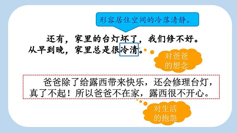 以前爸爸会和露西一起玩,现在爸爸不在家,缺少了这份快乐,所以露西不开心。