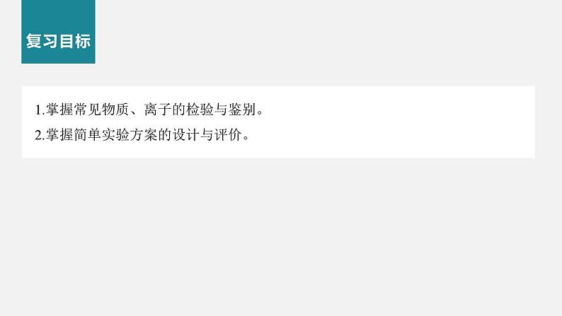 1.掌握常见物质、离子的检验与鉴别。2.掌握简单实验方案的设计与评价。