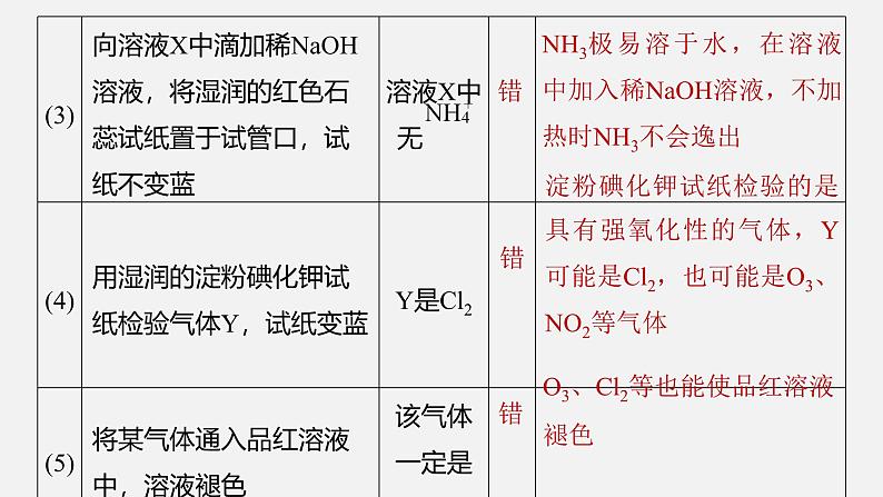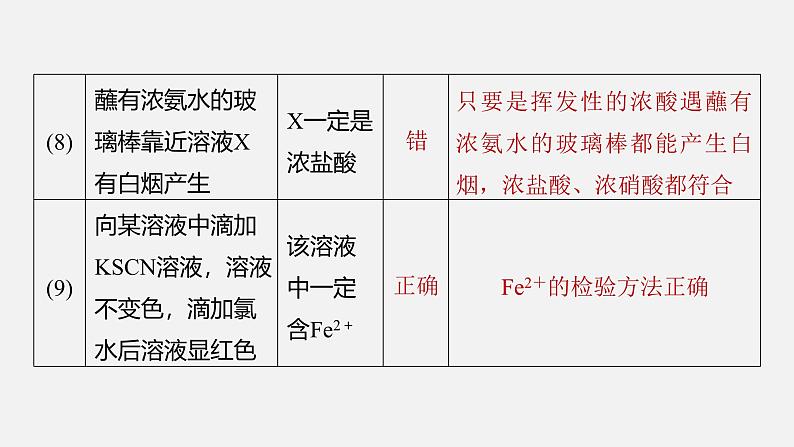 检验Fe2+的试剂为K3[Fe(CN)6]溶液,现象为生成蓝色沉淀,A错误; 与碱反应(可加热)产生NH3,NH3能使湿润的红色石蕊试纸变蓝,B正确;检验Cl-所用试剂为硝酸银溶液和稀硝酸,氯化银(白色)沉淀不溶于稀硝酸,排除碳酸银等沉淀的干扰,C正确;检验 ,通常先加盐酸排除干扰离子,再滴加氯化钡溶液时即析出白色沉淀。