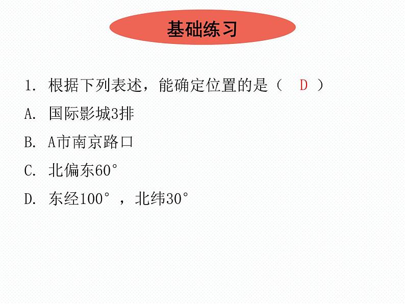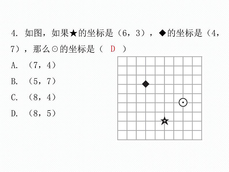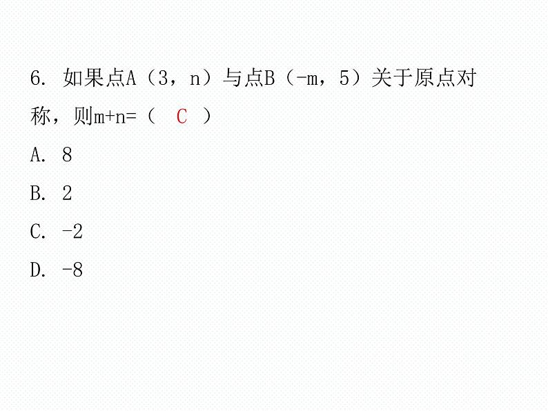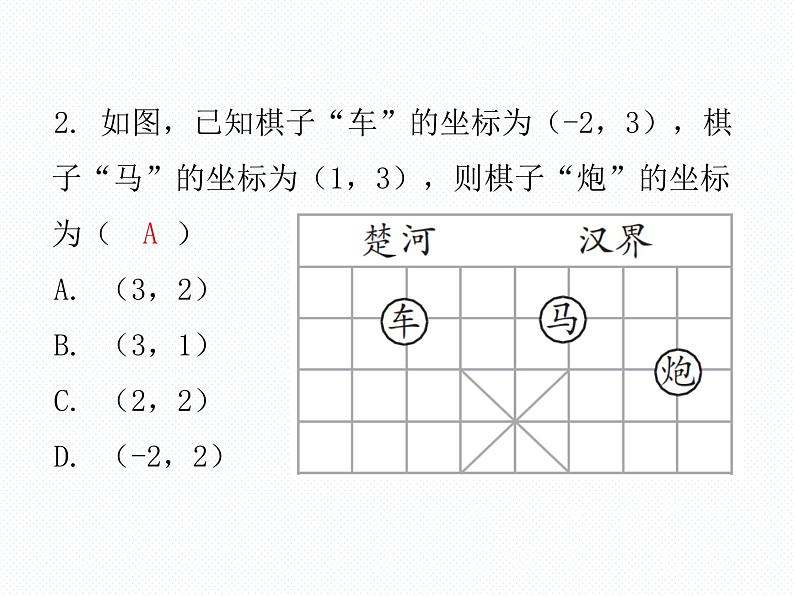 1. 根据下列表述,能确定位置的是( )A. 国际影城3排 B. A市南京路口 C. 北偏东60° D. 东经100°,北纬30°基础练习D 2. 如图,已知棋子“车”的坐标为(-2,3),棋子“马”的坐标为(1,3),则棋子“炮”的坐标为( )A. (3,2) B. (3,1) C. (2,2) D. (-2,2)A 3. 在平面直角坐标系中,点A的坐标为(-3,4),那么下列说法正确的是( )A. 点A与点C(3,-4)关于x轴对称 B. 点A与点B(-3,-4)关于y轴对称C. 点A与点F(3,-4)关于原点对称 D. 点A与点E(3,4)关于第一、三象限的平分线对称C 4. 如图,如果★的坐标是(6,3),◆的坐标是(4,7),那么☉的坐标是( )A. (7,4) B. (5,7) C. (8,4) D. (8,5)D5. 如图,△OAB和△OCB关于x轴对称,△OCD和△OED关于y轴对称,若点E的坐标为(4,-6),则点A的坐标为( )A. (4,-6) B. (-4,-6) C. (-4,6) D. (4,6)C6. 如果点A(3,n)与点B(-m,5)关于原点对称,则m+n=( )A. 8 B. 2 C. -2 D. -8C7. 在平面直角坐标系中,将点A(2,1)先向左平移3个单位长度,再向下平移4个单位后的坐标为 .(-1,-3)8. 如图,这是某市部分建筑分布简图,请以火车站的坐标为(-1,2),市场的坐标为(3,5)建立平面直角坐标系,并分别写出超市、体育场和医院的坐标.9. 如图,在平面直角坐标系xOy中,已知点P(1,2).(1)在平面直角坐标系中描出点P(保留画图痕迹);(2)如果先将点P向左平移3个单位长度,再向上平移1个单位长度得到点P′,则点P′的坐标为 .(3)点A在坐标轴上,若S△OAP=2,直接写出满足条件的点A的坐标.(2)先将点P向左平移3个单位长度,再向上平移1个单位长度得到点P′,则点P′的坐标为(-2,3). 故填(-2,3).(3)点A在坐标轴上,S△OAP=2,则点A的坐标为(0,4)或(0,-4)或(2,0)或(-2,0).综合练习10. 已知点M(3,-4),在x轴上有一点与M的距离为5,则该点的坐标为( )A. (6,0) B. (0,1)C. (0,-8) D. (6,0)或(0,0)D11. 已知平面内有一点A的横坐标为-6,且到原点的距离等于10,则A点的坐标为 .(-6,8)或(-6,-8)12. 若|a-2|+(b-5)2=0,则点P(a,b)关于x轴对称的点的坐标为 .(2,-5)13. 点(2+a,3)关于y轴对称的点的坐标是(-4,2-b),则ab= .14. 如图,表示的是图书室、超市、银行和餐馆的位置关系.(1)以图书室为参照点,请用方位角和图中所标示的距离分别表示出超市、银行和餐馆的位置;(2)火车站在图书室的南偏东60°的方向上,并且火车站与图书室的距离和银行与图书室的距离相等,请在图中画出火车站的位置.解:(1)超市在图书室南偏西70°方向上,且距离图书室2.8 km;银行在图书室北偏东30°方向上,且距离图书室3.2 km;餐馆在图书室北偏西50°方向上,且距离图书室1.8 km.15. 已知A(0,1),B(2,0),C(4,3).(1)在如图所示的平面直角坐标系中描出各点,并画出△ABC;(2)△ABC的面积为 ;(3)设点P在坐标轴上,且△ABP与△ABC的面积相等,求点P的坐标.(2)△ABC的面积为 ;4