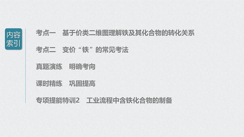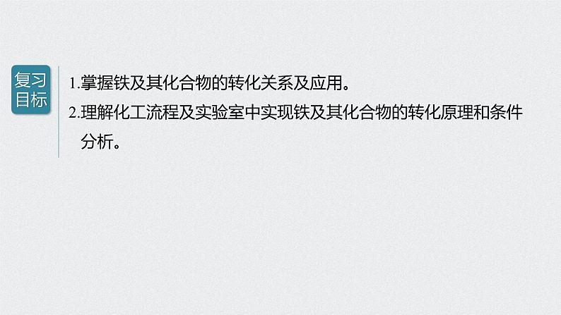 1.掌握铁及其化合物的转化关系及应用。2.理解化工流程及实验室中实现铁及其化合物的转化原理和条件 分析。