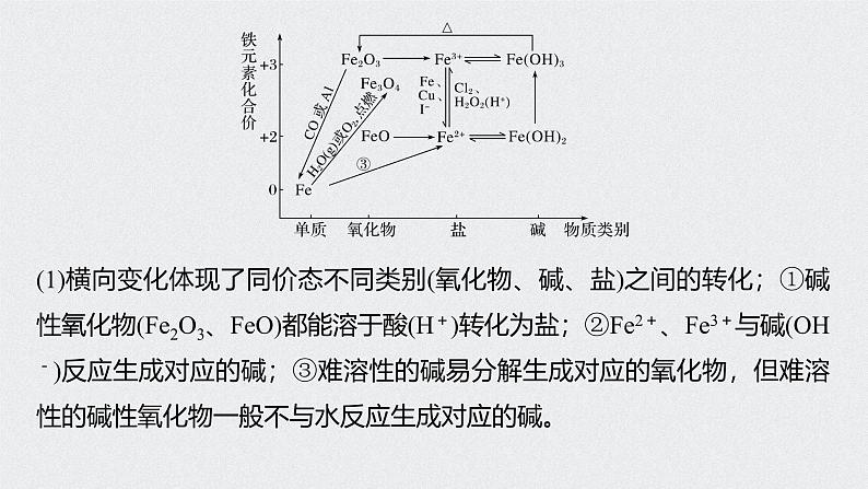 (1)横向变化体现了同价态不同类别(氧化物、碱、盐)之间的转化;①碱性氧化物(Fe2O3、FeO)都能溶于酸(H+)转化为盐;②Fe2+、Fe3+与碱(OH-)反应生成对应的碱;③难溶性的碱易分解生成对应的氧化物,但难溶性的碱性氧化物一般不与水反应生成对应的碱。