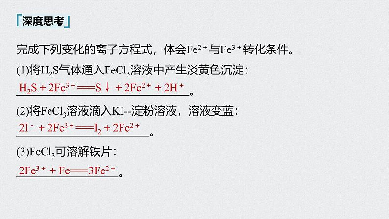 完成下列变化的离子方程式,体会Fe2+与Fe3+转化条件。(1)将H2S气体通入FeCl3溶液中产生淡黄色沉淀: 。(2)将FeCl3溶液滴入KI-淀粉溶液,溶液变蓝: 。(3)FeCl3可溶解铁片: 。