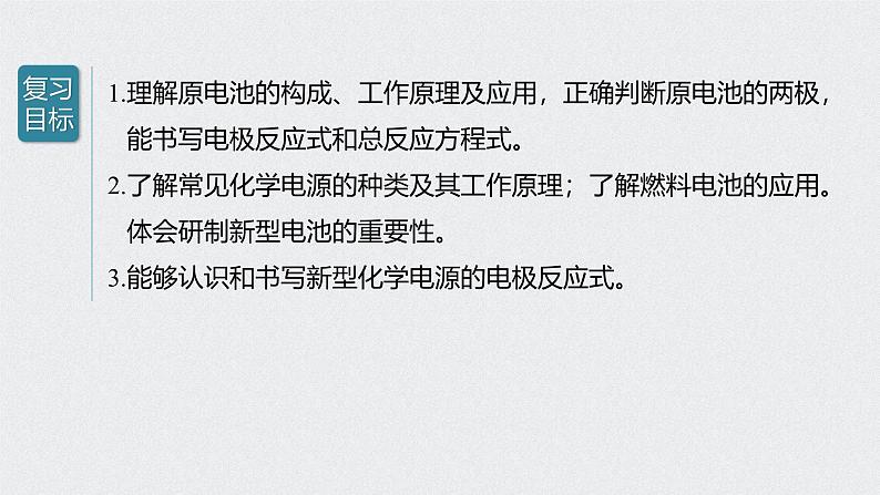 1.理解原电池的构成、工作原理及应用,正确判断原电池的两极, 能书写电极反应式和总反应方程式。2.了解常见化学电源的种类及其工作原理;了解燃料电池的应用。 体会研制新型电池的重要性。3.能够认识和书写新型化学电源的电极反应式。