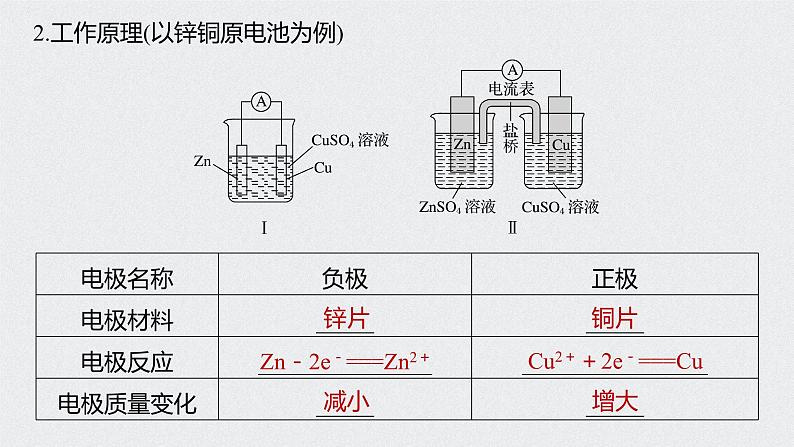1.原电池的概念及构成条件(1)定义:把 转化为 的装置。(2)原电池的形成条件①能自发进行的 。②两个金属活动性不同的电极(燃料电池的两个电极可以相同)。③形成 ,需满足三个条件:a.存在电解质;b.两电极直接或间接接触;c.两电极插入电解质溶液或熔融电解质中。