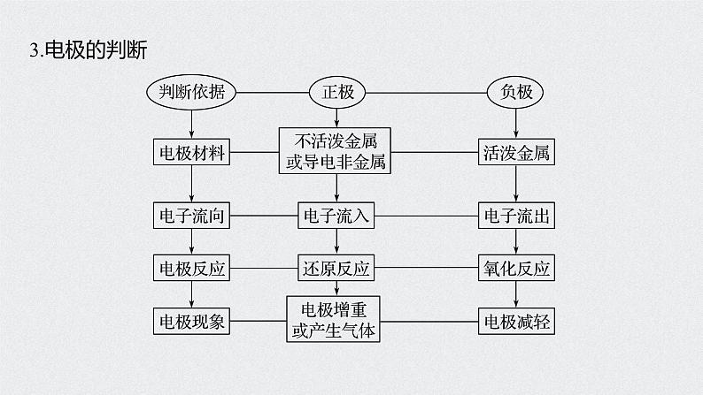 2.原电池电解质的选择电解质是使负极放电的物质,因此一般情况下电解质溶液[或者电解质溶液中溶解的其他物质(如溶液中溶解的氧气)]要能够与负极发生反应。3.原电池电极材料的选择原电池的电极必须能导电;负极一般情况下能够与电解质溶液反应,容易失电子,因此负极一般是活泼的金属材料;正极和负极之间只有产生电势差时,电子才能定向移动,所以正极和负极一般不用同一种材料。