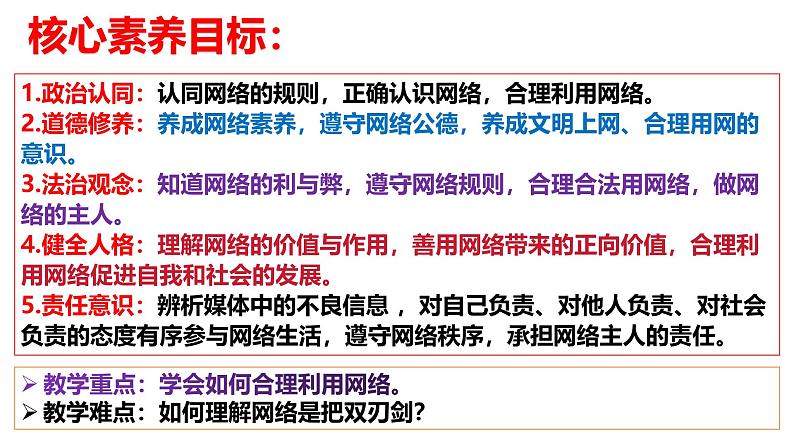 1.政治认同:认同网络的规则,正确认识网络,合理利用网络。2.道德修养:养成网络素养,遵守网络公德,养成文明上网、合理用网的意识。3.法治观念:知道网络的利与弊,遵守网络规则,合理合法用网络,做网络的主人。4.健全人格:理解网络的价值与作用,善用网络带来的正向价值,合理利用网络促进自我和社会的发展。5.责任意识:辨析媒体中的不良信息 ,对自己负责、对他人负责、对社会负责的态度有序参与网络生活,遵守网络秩序,承担网络主人的责任。