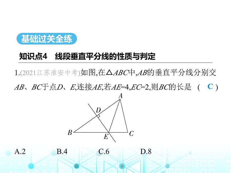 1.(2021江苏淮安中考)如图,在△ABC中,AB的垂直平分线分别交AB、BC于点D、E,连接AE,若AE=4,EC=2,则BC的长是 ( ) A.2 B.4 C.6 D.8