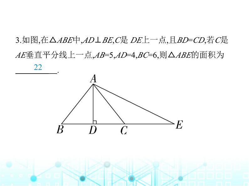 解析 ∵BD=CD,AD⊥BE,∴AC=AB=5.∵C是AE垂直平分线上一点,∴CE=AC=5,∴BE=BC+CE=6+5=11,∴S△ABE= BE·AD= ×11×4=22.