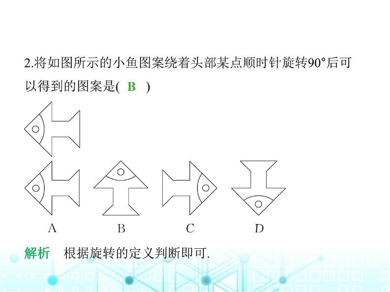 2.将如图所示的小鱼图案绕着头部某点顺时针旋转90°后可 以得到的图案是( )