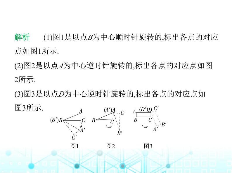解析 (1)图1是以点B为中心顺时针旋转的,标出各点的对应 点如图1所示.(2)图2是以点A为中心逆时针旋转的,标出各点的对应点如图 2所示.(3)图3是以点D为中心逆时针旋转的,标出各点的对应点如 图3所示.