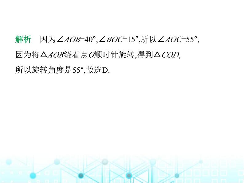 解析 因为∠AOB=40°,∠BOC=15°,所以∠AOC=55°,因为将△AOB绕着点O顺时针旋转,得到△COD,所以旋转角度是55°,故选D.