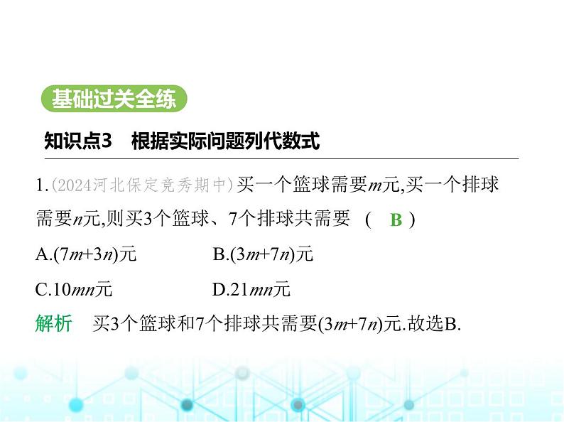 展开1.(2024河北保定竞秀期中)买一个篮球需要m元,买一个排球 需要n元,则买3个篮球、7个排球共需要 ( )A.(7m+3n)元 B.(3m+7n)元C.10mn元 D.21mn元