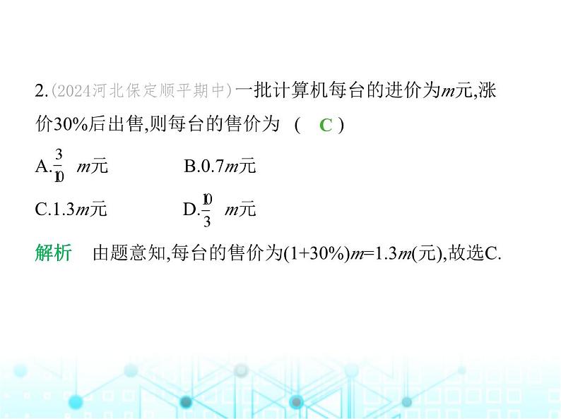 2.(2024河北保定顺平期中)一批计算机每台的进价为m元,涨 价30%后出售,则每台的售价为 ( )A. m元 元 元 D. m元