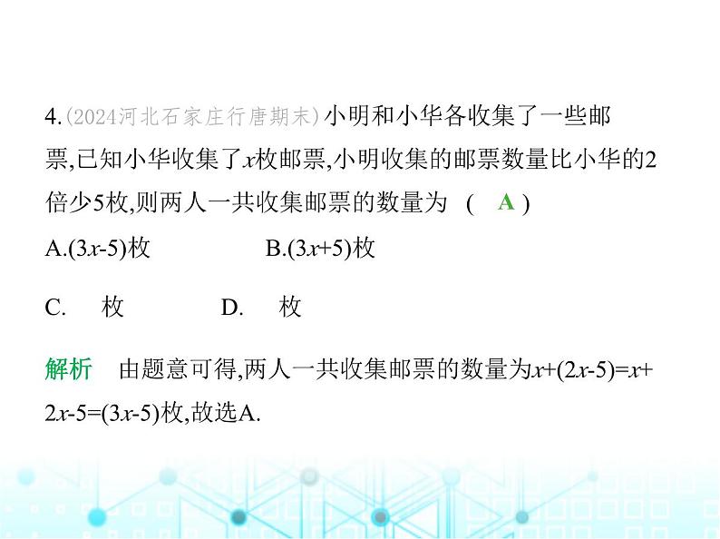 4.(2024河北石家庄行唐期末)小明和小华各收集了一些邮 票,已知小华收集了x枚邮票,小明收集的邮票数量比小华的2 倍少5枚,则两人一共收集邮票的数量为 ( )A.(3x-5)枚 B.(3x+5)枚C. 枚 D. 枚