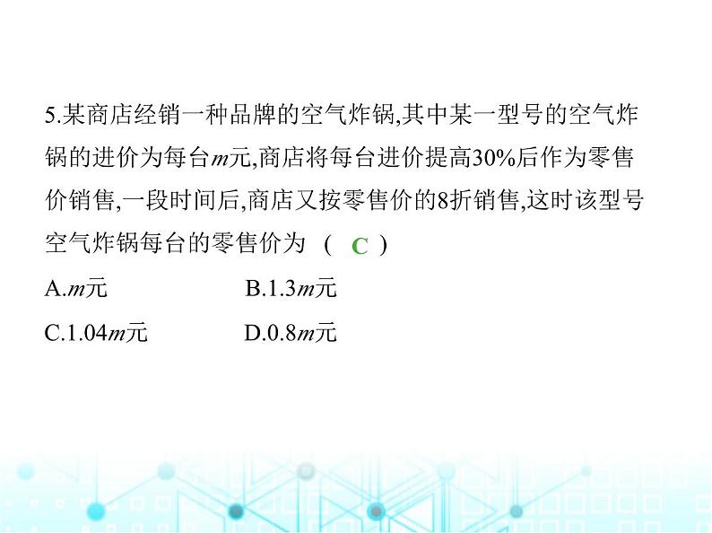 5.某商店经销一种品牌的空气炸锅,其中某一型号的空气炸 锅的进价为每台m元,商店将每台进价提高30%后作为零售 价销售,一段时间后,商店又按零售价的8折销售,这时该型号 空气炸锅每台的零售价为 ( )A.m元 元 元 元