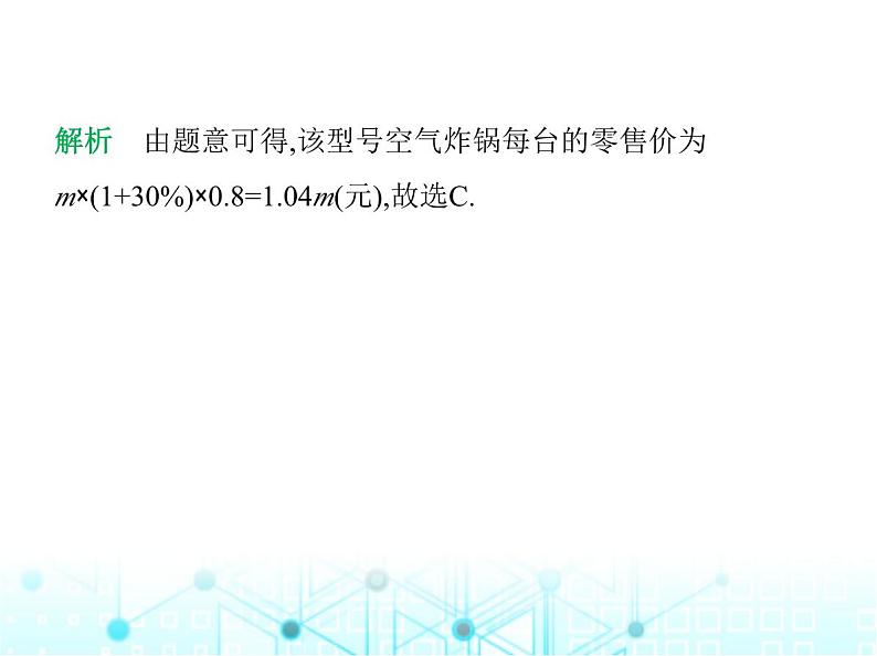解析 由题意可得,该型号空气炸锅每台的零售价为m×(1+30%)×0.8=1.04m(元),故选C.